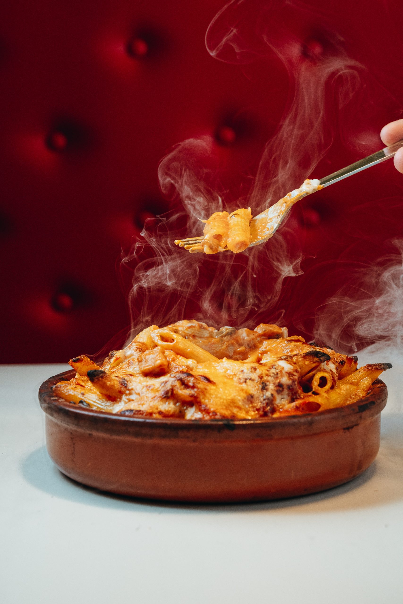 Ricetta dello chef con crema di panna e pancetta, fatta al momento, gratinata al forno con Parmigiano Reggiano DOP (24 mesi).