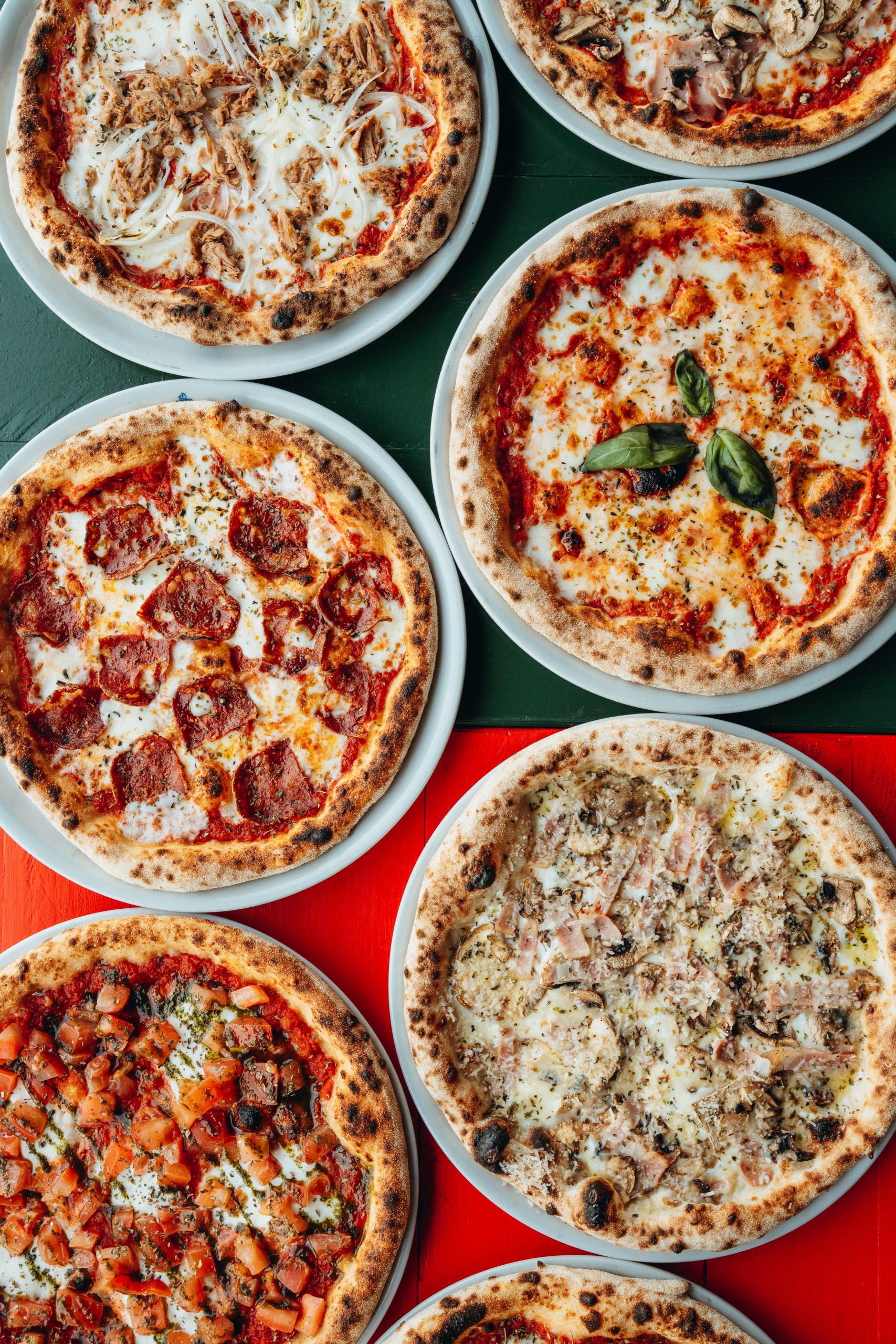 Pomodoro, basilico, mozzarella fiordilatte, prosciutto cotto e funghi.