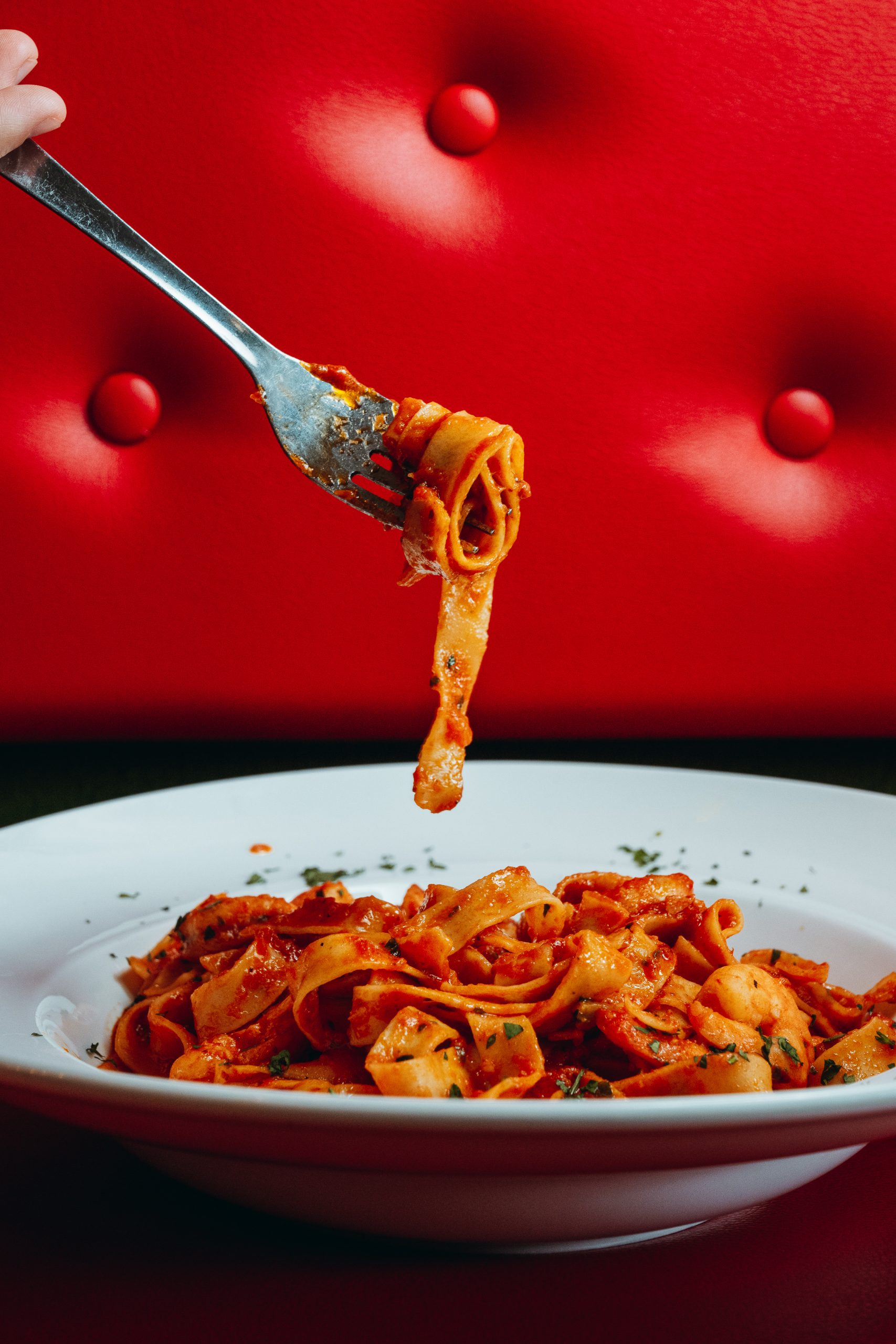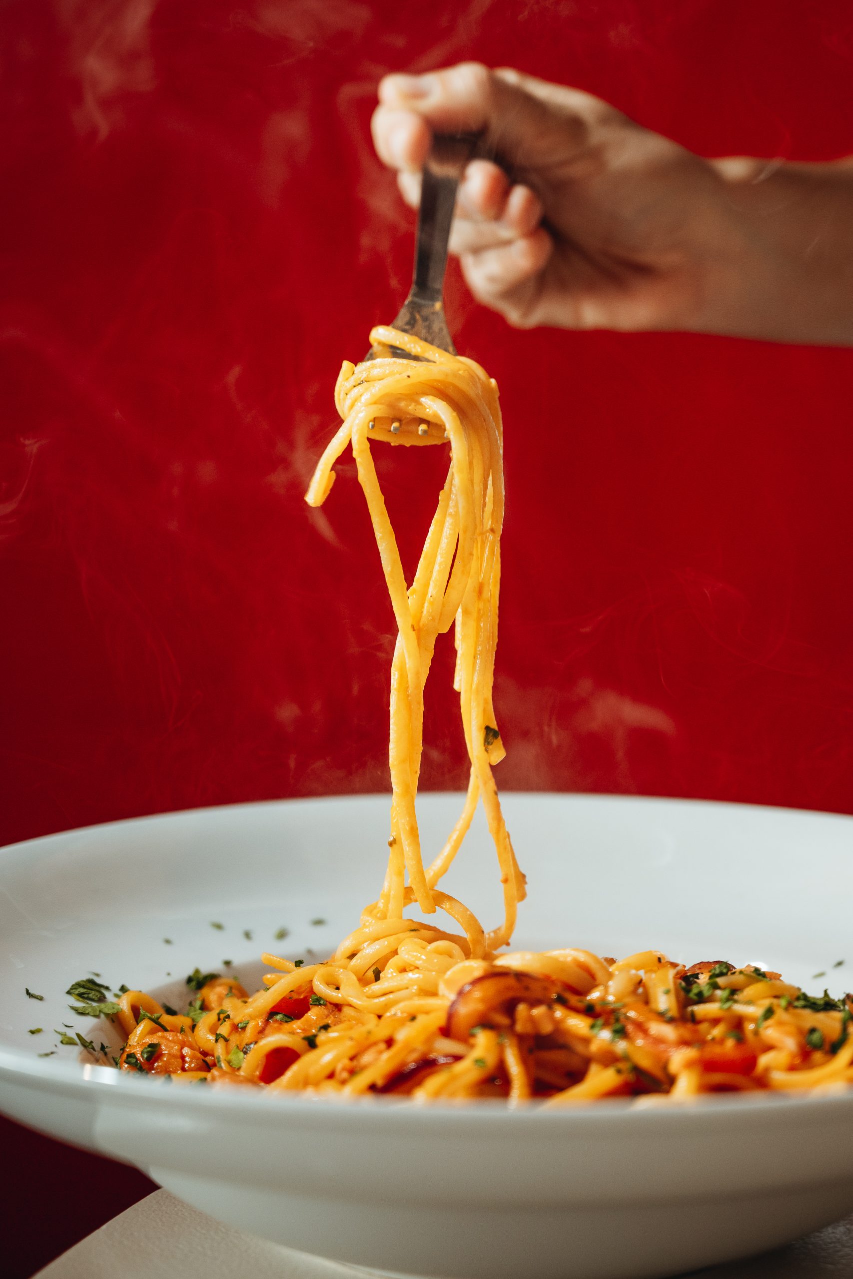 Pasta corta speciale con salmone fresco saltato al momento, cipolla rossa, capperi, olive Gaeta, pomodorini nella loro salsa, flambé con vodka e panna fresca.